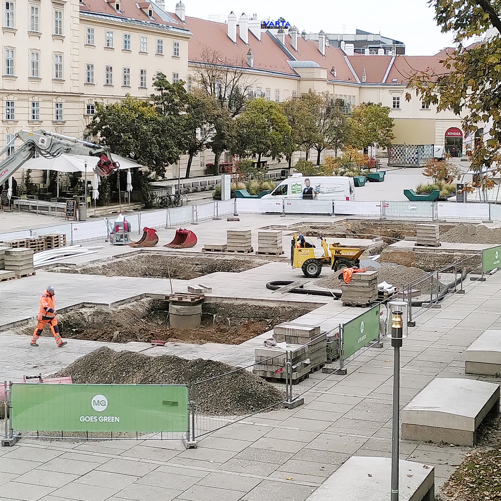 Unter dem Motto MQ GOES GREEN werden ergänzend zu den Fassadenbegrünungen bald auch grüne Pflanzinseln die Höfe beschatten und verschönern. Die Bauarbeiten gehen zügig voran, schon im nächsten Frühling werden die grünen Inseln für bunte Blüh-Freuden und schattige Platzerl sorgen.