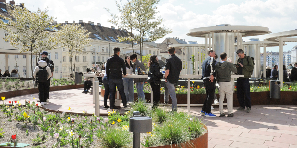 Die barrierefrei zugängliche Terrasse bietet einen Rundumblick auf den historischen Naschmarkt, den Flohmarkt und den Naschpark. Aktuell ist hier viel los: Menschen genießen die Sonne, verbringen Zeit im Grünen und nutzen den Dachgarten zum Verweilen.