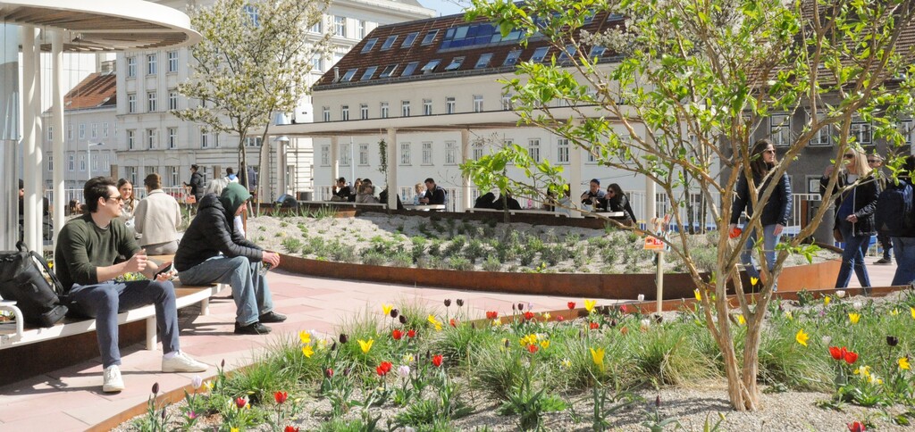 Der Dachgarten auf dem Marktraum am Naschmarkt steht in voller Blüte. In den wärmeren Jahreszeiten wird er gemeinsam mit dem benachbarten Naschpark zu einem beliebten Aufenthaltsort mitten in der Stadt.
