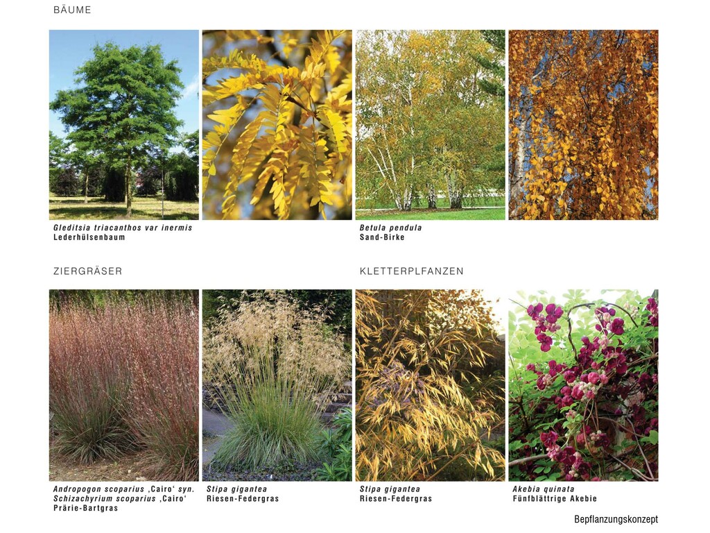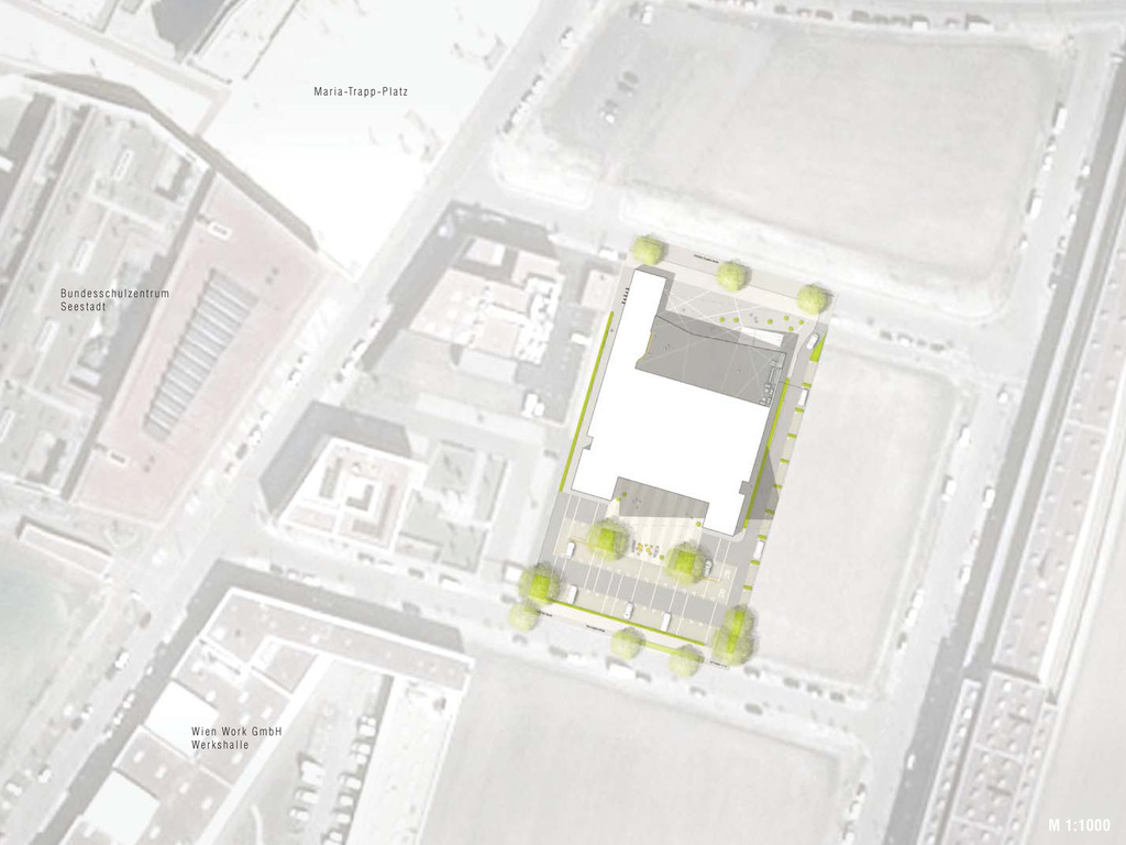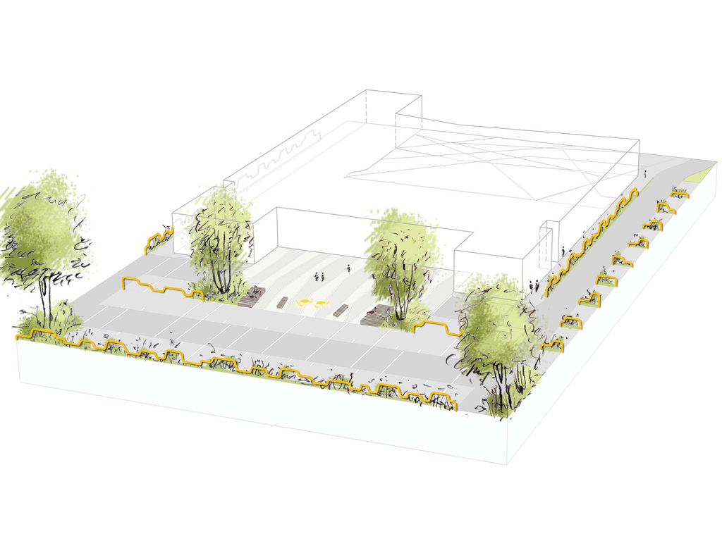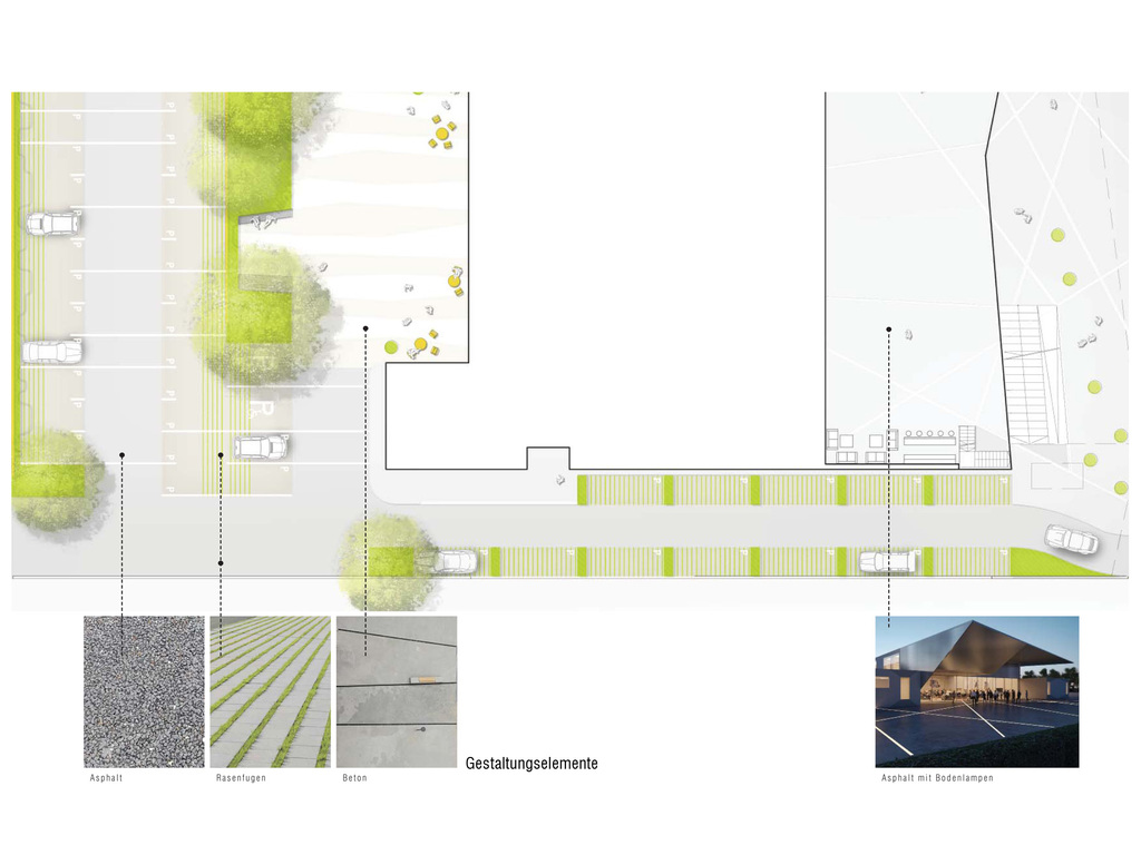 Die zur Verfügung stehenden Flächen ergeben 3 Teilbereiche die durch ein Linienmuster gestalterisch zusammengehalten werden. Der Vorplatz ist von sehr stark sich kreuzenden Lichtstreifen durchzogen, der nach Norden orientierte, erweiterte Hallenbereich weist ein leicht geknicktes Bodenmuster auf und der anschließende Parkplatz übernimmt gerade Linien. Zusammengehalten bzw. genäht werden die Flächen durch den gelben Faden. Wie bei einem Kleidungsstück verbraucht der Faden sehr wenig Platz kann aber durch die Setzung der Linie der Art des Musters und der Farbe eine tragende gestalterische Rolle spielen. Als sich aufwölbendes Gestaltungselement bildet der Faden Ränder aus, lässt sich bewachsen, trennt Bereiche, taucht ab und durchzieht das gesamte Gebiet. Der gelbe Faden wird als pulverbeschichtetes Stahlrohr ausgeführt.