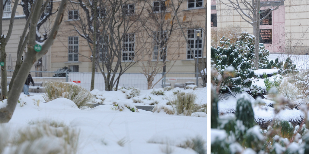 Nach der temporären Begrünung im Wiener MQ finden die Pflanzen nun nach und nach in dauerhafte Pflanzinseln und Tröge. Dazu wurden vorab Probebohrungen durchgeführt, im Herbst 2025 werden die ersten Pflanztröge installiert. Das Pflanzkonzept sieht einen Farbverlauf aus verschiedenen Blühaspekten vor, der sich durch die Höfe des MQs ziehen wird. Die Pflanzen der temporären Begrünung werden dafür in permanente Beete gepflanzt und durch weitere Arten ergänzt. Schwammkörper unter dem Boden sorgen dann für zusätzliche Wasserspeicherkapazitäten und verbessertes Wurzelwachstum, damit die Bäume im MQ auch ihre gewünschte Größe erreichen können.